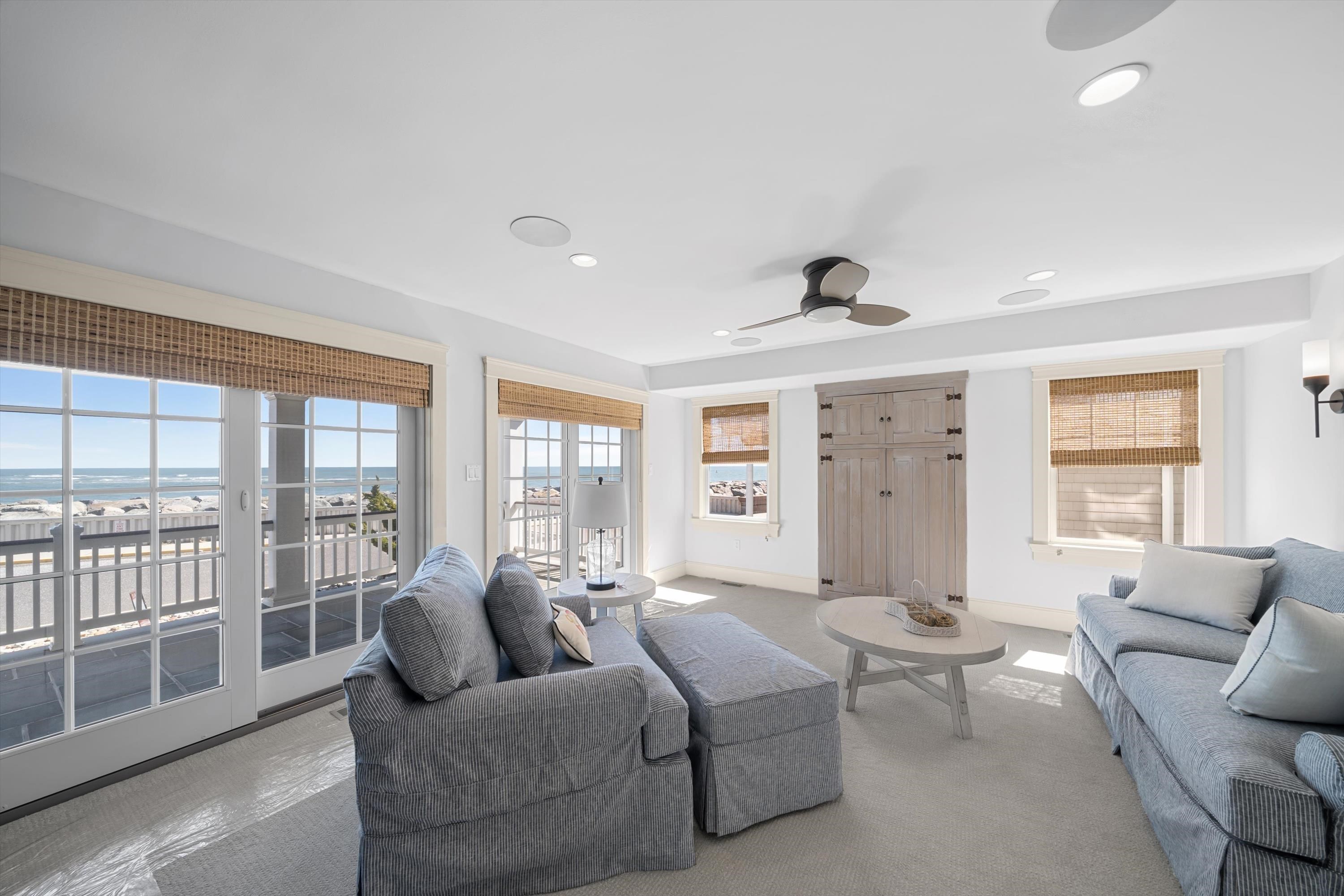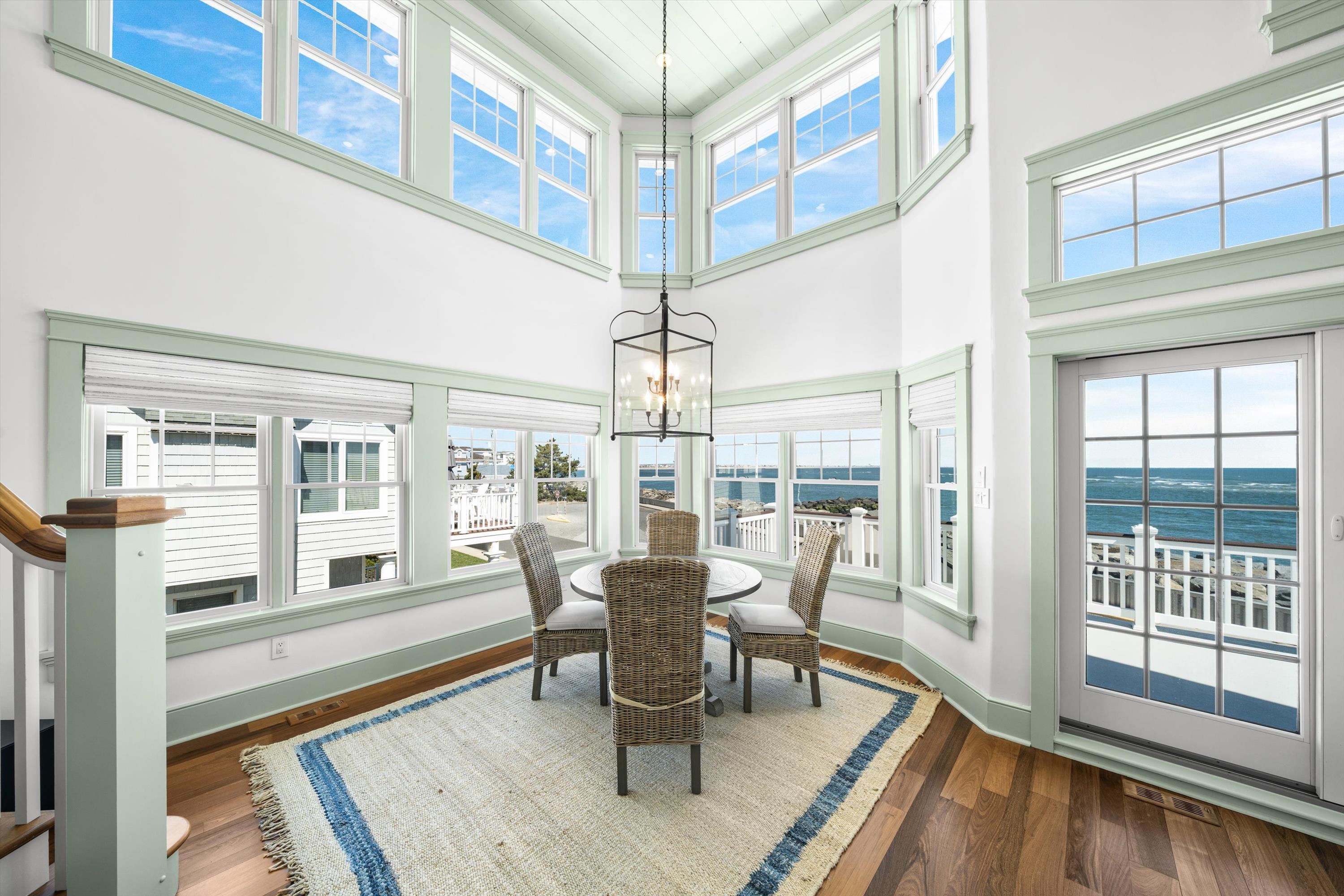 Jaw dropping, sensational ocean views all the way to Atlantic City. Beach access just around the corner without crossing any streets. WONDERFUL REFRESH JUST COMPLETED INCLUDING WALLS PAINTED THROUGHOUT, NEW FURNISHINGS, NEW LIGHTING, NEW CARPETING IN ALL BEDROOMS, NEW FIREPLACE FACADE AND EXTERIOR POWERWASHED. Brandywine Developers custom built this 3-story very special upside-down style home, offering 5 or 6 bedrooms and four beautiful, designer tile baths. The bluestone covered porch entry with mahogany door invites you into a sun filled foyer, first floor oceanfront family room with wet bar, three bedrooms, one ensuite bath, one hall bath and a functional laundry room with outside exit. Enjoy days by the heated in ground swimming pool with cabana, roll down shutter and automated sunshade. A beautiful custom cherry staircase leads to a fabulous vaulted, oceanfront, second floor great room with Brazilian walnut floors, wood planked ceiling, gorgeous fireplace, a wall of glass and simply breathtaking ocean views. The chef s kitchen has fabulous custom cabinets, large center island with 2 stage stone and wood tops, ultra-high-end appliances, beautiful tile backsplash, and a very spacious dining area, separate from the main living area. The second floor has a sunlit, second family room or sixth bedroom with custom tiled floors, another large guest bedroom, beautiful hall bath and easy access to a spacious sundeck with a convenient stair to the pool. The third floor has a balcony with an extraordinary ocean view, large primary bedroom, sumptuous ensuite bath with custom cabinets, twin bowl, fabulous shower, and soaking tub. A cozy den, office, or exercise area sits just off the primary bedroom with direct access to a private deck with wonderful views of the ocean, jetty and has an exterior. Third floor has a second, private laundry area. The special features include great deck space, custom tile work throughout, custom millwork, high end plumbing fixtures, beautiful natural slate floors, 3 zone gas FHA heat and central air, beautiful 5 panel doors and much more. The A C compressors are three years old. Pool equipment heater, pump and filter are two years old. The third floor master deck has been reinforced to allow installation of a hot tub should buyer desire. Home is easy to show and is offered fully and beautifully furnished.
